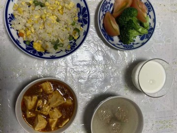 ①大阪学生宿舍(中華炒飯,鶏肉と根菜の甘酢煮,レタスサラダ,中華スープ(しいたけと人参),果物,お茶かコーヒ)(中国炒饭,